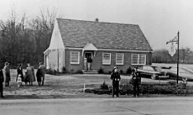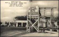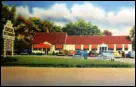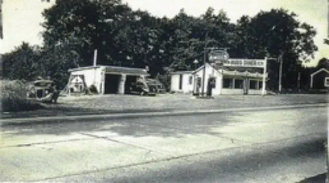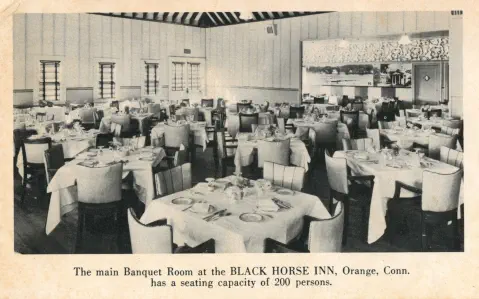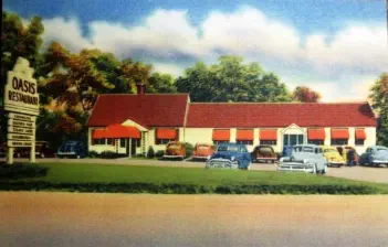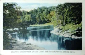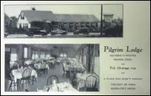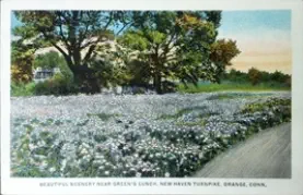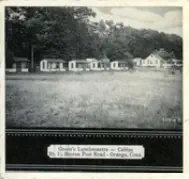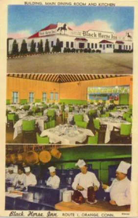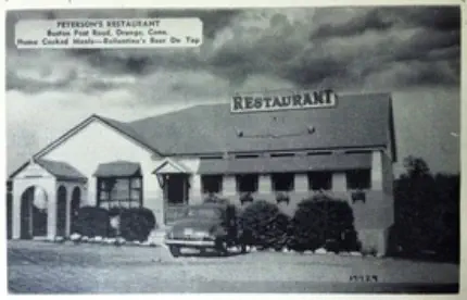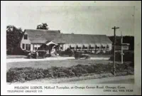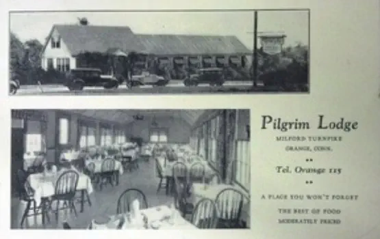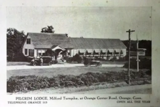 JimDaleClothes,locatedonthePostRoadandtheFireliteShopattheintersectionofOldTavernandRacebrookRoadwerefashionable clothingshopsofthe1906s.Thename"firelite"harkensbacktothetimebeforethedressshopwhenitwasafireplaceandaccessories store. The sign for the shopping center has retained the original candle flame, which at one time was lit and moved.Green'sLuncheonetteandCabins,anearlystylemotel,waslocatedontheupperendofIndianRiverRoadandRacebrookRoad,southof thePostRoad.Justacrosstheroadwasthetrailerparkstilltheretoday.ThepastoralsceneswerealongtheIndianRiverwhichranbehind the property.Peterson's RestaurantPilgrim Lodge RestaurantKnownlaterasTheOasisandseeninthethreecardsabove,waslocatedatthesouthwestcornerofthePostRoadatSouthOrangeCenter Road. The change in the automobile models is evident. The Oasis was "family style" with excellent food and reasonable prices.The Black Horse InnPopular1950'srestaurantthatoncestoodontheBostonPostRoadnearwhereLushe'sDinerwas.It wasconsideredtobeoneofthefanciestrestaurantsintheareaandfamiliesfromaroundOrange chose it for their special celebrations.Amoco StationReportedlylocatedinthevicinityofDogwoodLane.Bud'sDinernextdoor lookslikeanotherlocaleaterythattookadvantageoftheheavyPostRoad traffic. OneofthemoreuniquepicturesofthePostRoadisGandy'sTruckStop locatedintheareanowoccupiedbyPartyCity.Theiceloadingdockin frontofthegaragewastomanuallydispenseicetothetrucksbothontopof the cargo and below.Orange Police StationPhotoontherightisOpenHouseforthenewlybuiltpolicestationin1950.ItslocationwasonthelandnowoccupiedbytheFirehouse just east of the four-bay garage.Wilson H. Lee Printing CompanyOneofthemostsignificantlandmarksonthePostRoadwasthatoftheWilsonH.LeePrintingCompany.Itwaserectedin1929and equippedwiththelatestmachineryfortheproductionofhigh-gradeprinting.Thetowerwasarchitecturallysignificantaswellas functional, holding water used in the printing process. The location is now occupied by Home Depot.